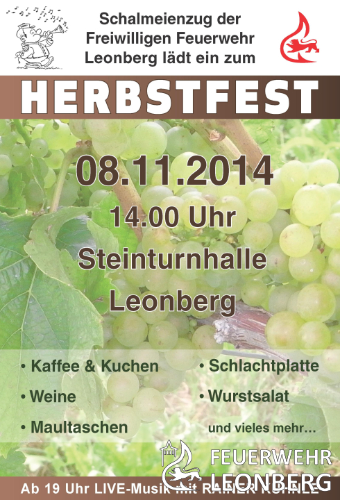 (mg) Am Samstag, 8. November 2014 findet ab 14 Uhr bereits das 4. Herbstfest des Schalmeienzugs der Freiwilligen Feuerwehr Leonberg in der Steinturnhalle statt.