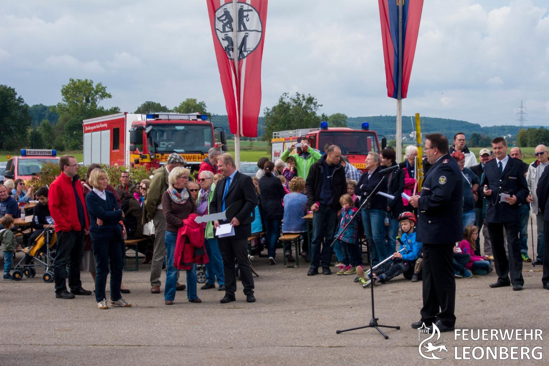 Unter den vielen Gästen waren auch einige Ortschafts- und Gemeinderäte, sowie der Kreisverbandsvorsitzende Markus Priesching und Kameraden aller Abteilungen der Feuerwehr Leonberg. Nach einer kurzen Ansprache übergab der Erste Bürgermeister Dr. Vonderheid den symbolischen Schlüssel an den Kommandanten Wolfgang Zimmermann. Dieser reichte ihn gleich der zuständigen Abteilungsführung aus Warmbronn Bernhard Spreiter und Steffen Bräunig weiter.