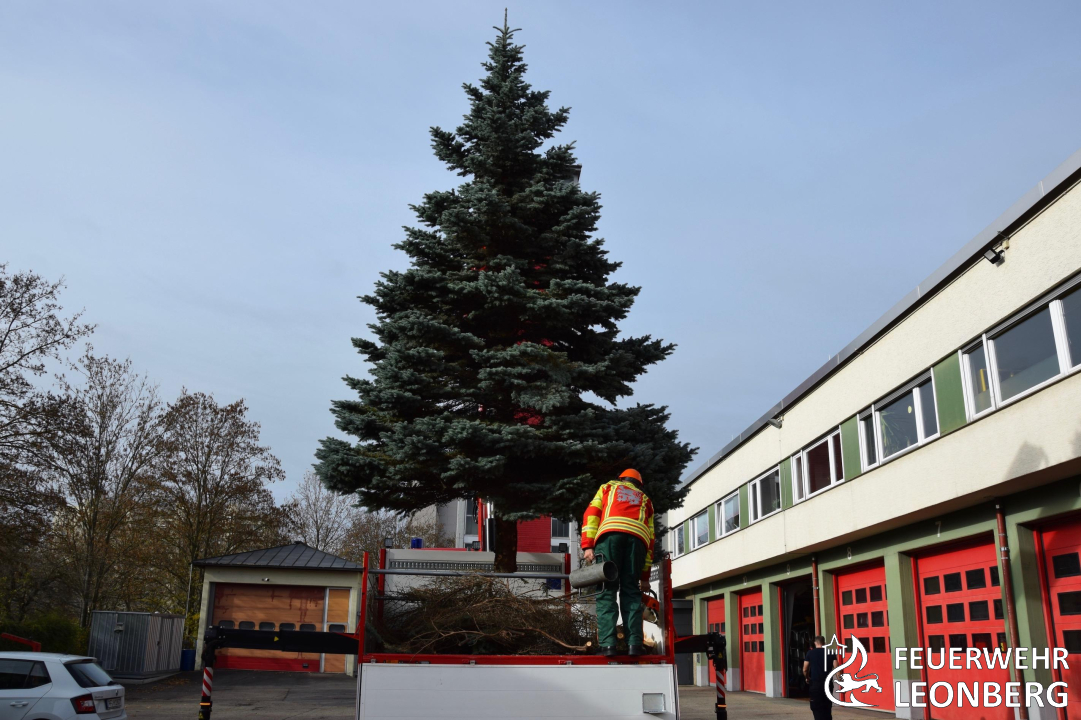 (mf) Einen besonderen Feuerwehreinsatz konnten Passanten am 17.11.2020 in der Feuerbacher Straße beobachten. Dort wurde nämlich eine gespendete Blautanne von zwei Feuerwehrleuten mit Hilfe des neuen Abrollbehälters-Kran aus einem Vorgarten gehievt, zur Feuerwache transportiert und auf das Dach der Fahrzeughalle gehoben.