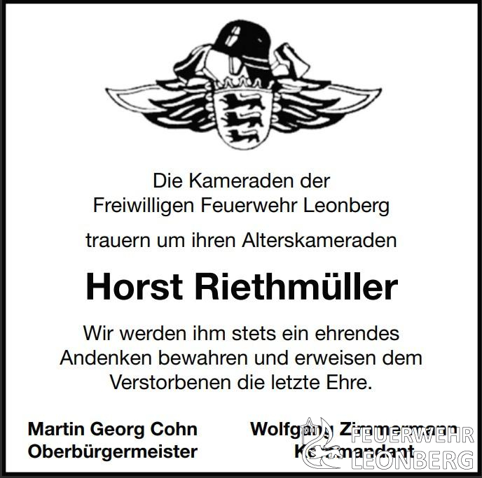 Unser Alterskamerad Horst Riethmüller von der Abteilung Leonberg ist am 09.03.2022 im Alter von 78 Jahren verstorben.