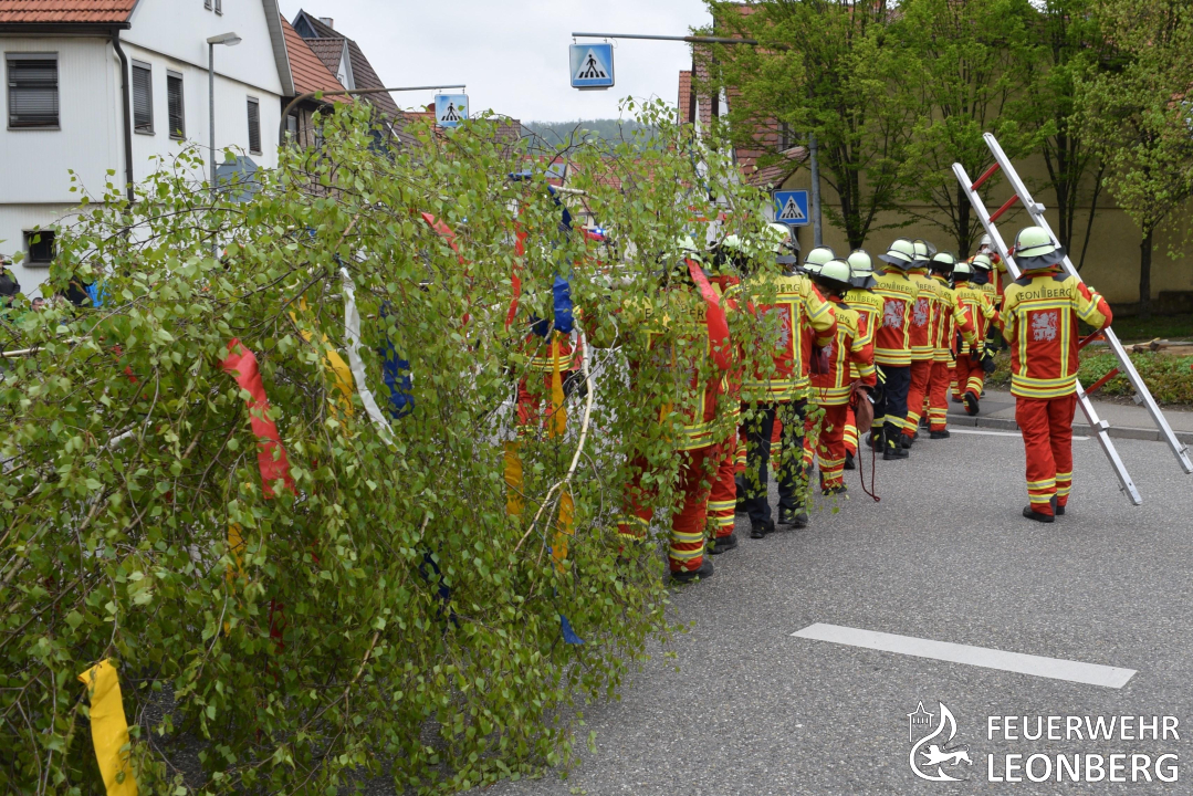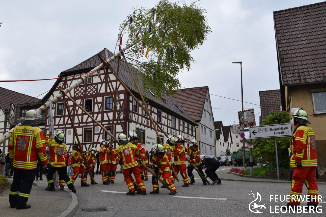 Am nächsten Morgen wurde der Baum geschmückt und anschließend zum Aufstellungsplatz transportiert. Um 10 Uhr stellten 22 Kameraden und Kameradinnen den ca. 18 Meter hohen Maibaum nach alter Tradition auf. Mit Leitern, Halteleinen, Schwalben (lange, mit Seilen verbundene Stangen) und purer Muskelkraft stemmten sie den Maibaum aufrecht, bis er in das vorgesehene Loch rutschte. Nachdem der Maibaum sicher verkeilt war, stiegt ein Kamerad auf die 4-teilige Steckleiter und entfernte die Halteleinen auf ca. 6 Meter Höhe.