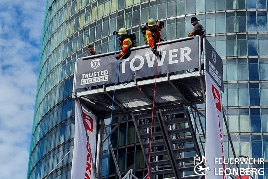 Die erste Herausforderung ist der Turmlauf. Nach dem Startsignal wird ein 19 kg schweres Schlauchpaket vom Boden aufgenommen und damit möglichst schnell auf den 12 m hohen Turm gestiegen. Oben angekommen muss eine 19 kg schwere Schlauchrolle an einem Seil nach oben gezogen werden.