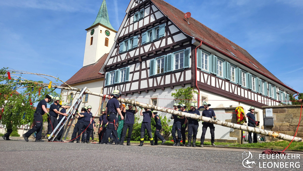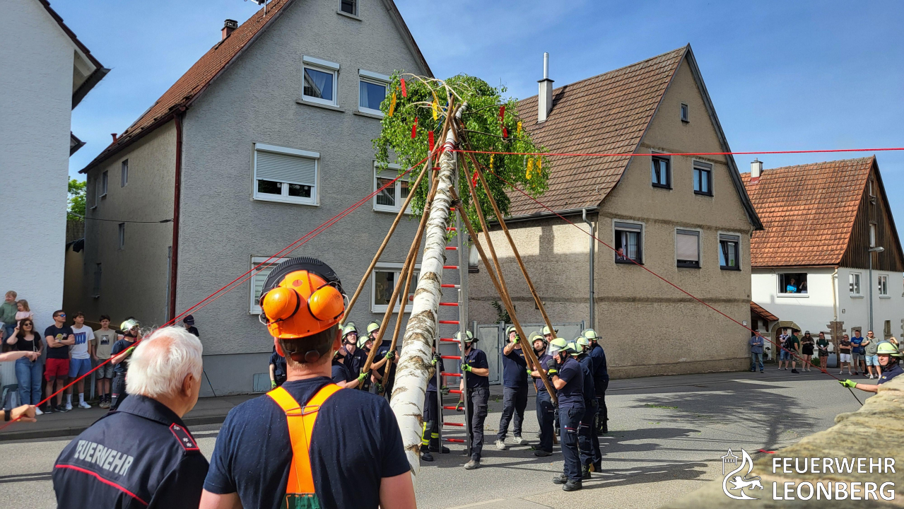Um 10 Uhr ertönten die Glocken aus dem Glockenturm von der Täufer-Johannes-Kirche und die 22 Kameradinnen und Kameraden stellten den ca. 18 Meter hohen Maibaum nach alter Tradition auf: mit Leitern, Halteleinen, Schwalben und purer Muskelkraft wurde der Maibaum in die Höhe gestemmt bis er in das dafür vorgesehene Loch rutschte. Nachdem der Baum stand wurde er mit Hilfe von Kanthölzern verkeilt. Der Maibaum steht nun wieder am Pfarrhaus im Herzen von Warmbronn.