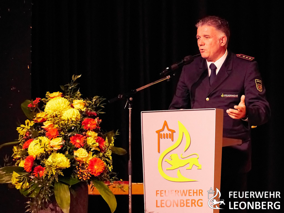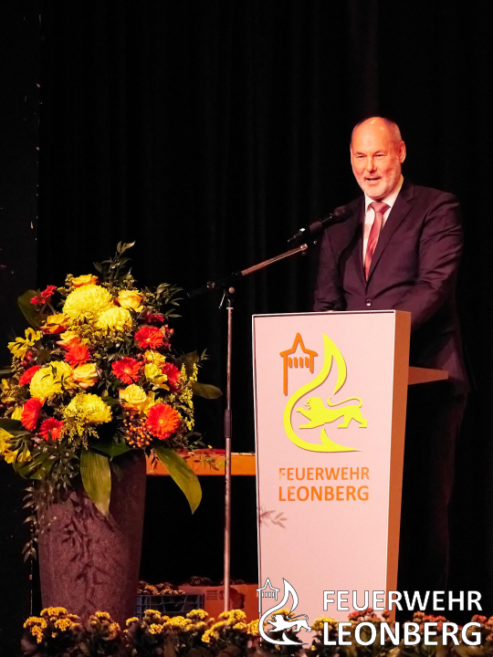 In seinem Grußwort bedankte sich Herr Oberbürgermeister Cohn bei den Feuerwehrmitgliedern für ihren unermüdlichen Einsatz für die Bürgerinnen und Bürger der Stadt Leonberg; rund um die Uhr und an 365 Tagen im Jahr.