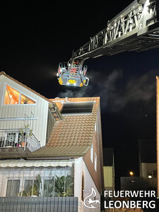 Über die Leonberger Drehleiter wurde der Kamin und der angrenzende Dachbereich des Wohnhauses kontrolliert. Zudem konnte ein Schornsteinfeger über die Drehleiter den Kamin von brennendem Ruß befreien. (jk)