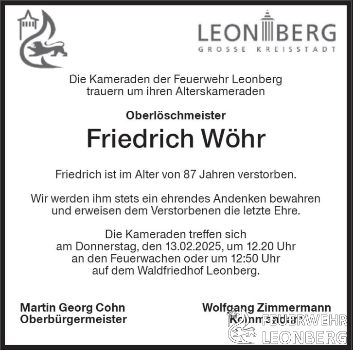 Die Trauerfeier mit anschließender Beisetzung für unseren Kameraden Friedrich Wöhr findet am Donnerstag, den 13.02.2025 um 13:20 Uhr auf dem Waldfriedhof Leonberg statt.