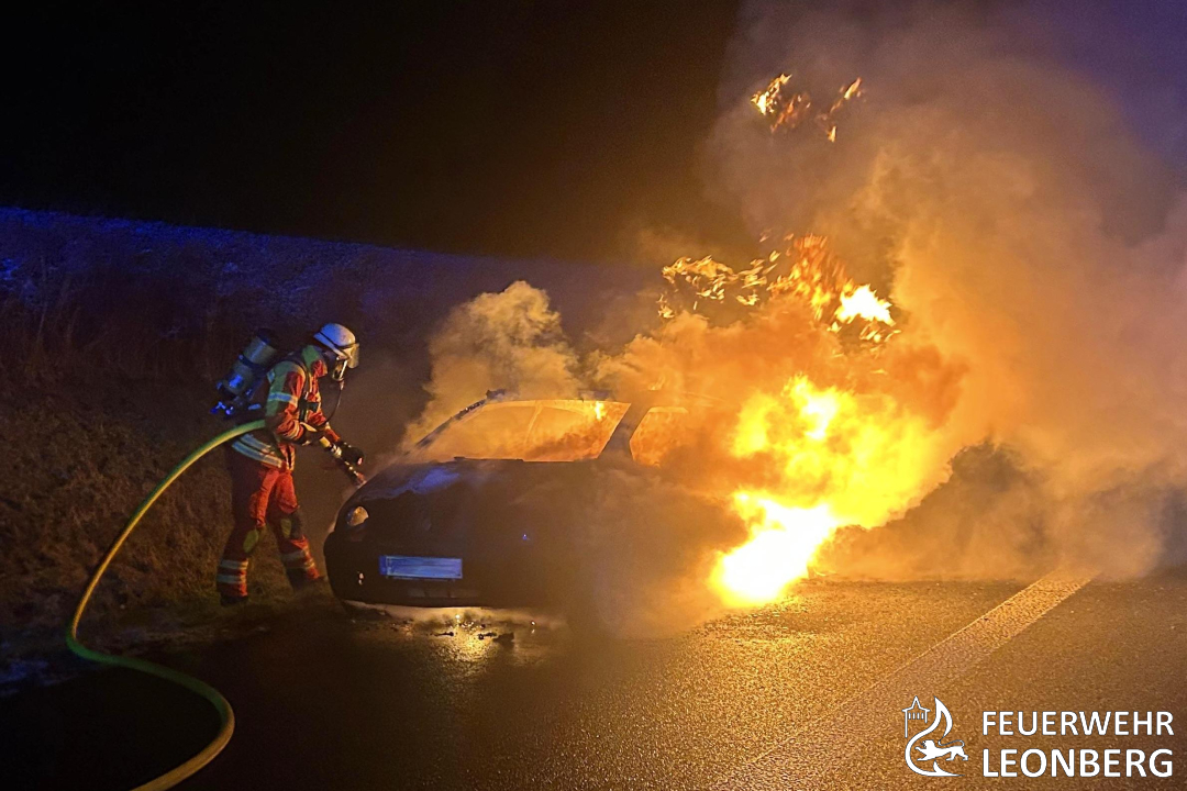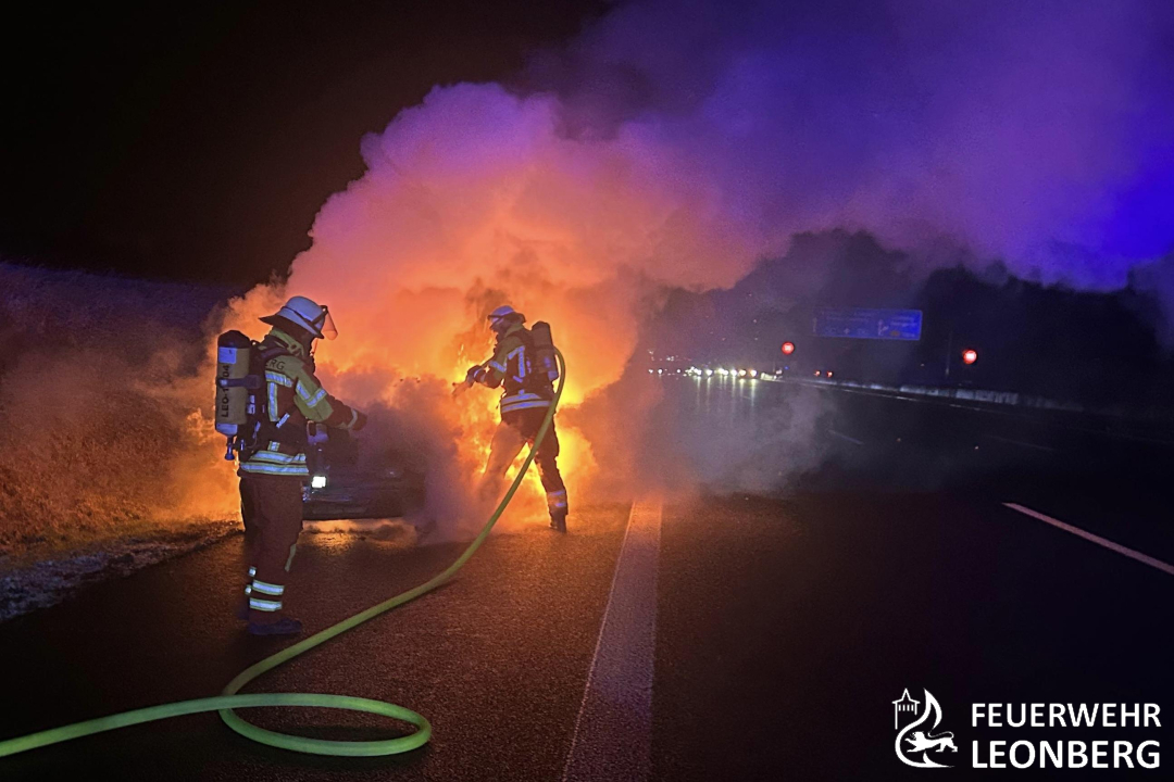 Datum: 14.02.2026 Alarmzeit: 23:44 Uhr Stichwort: Pkw-Brand Einsatzort: Leonberg, Autobahn 8, Fahrtrichtung Karlsruhe