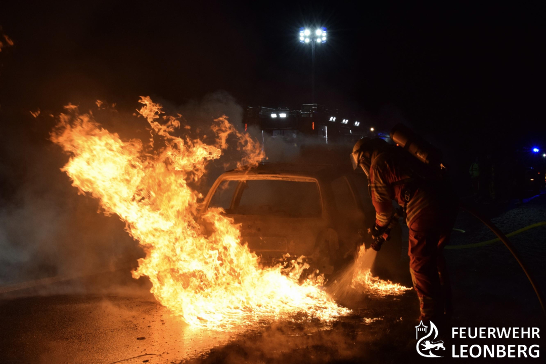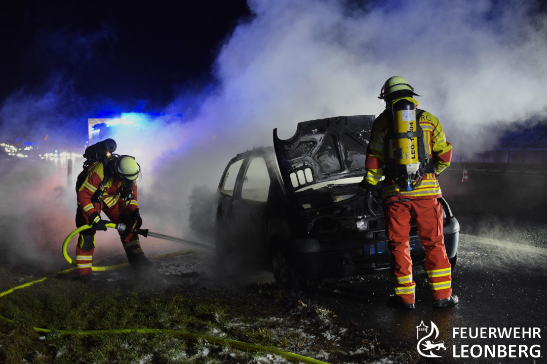 Die Freiwillige Feuerwehr Leonberg wurde auf die Autobahn 8 in Fahrtrichtung Karlsruhe alarmiert. Dort war ein brennender Personenwagen auf dem Standstreifen gemeldet.