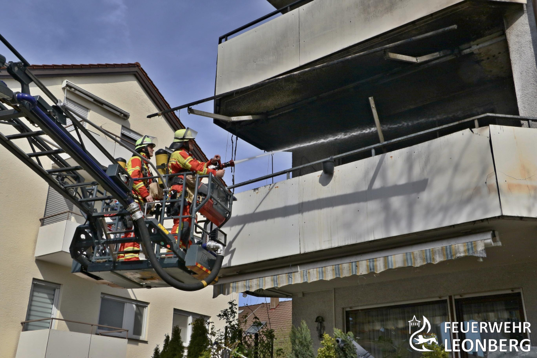 Von außen wurden zwei weitere Löschrohre zur Bekämpfung des sich entwickelnden Balkonbrandes und zum Schutz der Geschosse über der Brandwohnung eingesetzt. Die umfassenden Löscharbeiten zeigten rasch Wirkung und schon nach wenigen Minuten war die Gefahr einer Brandausbreitung gebannt. Für die Nachlöscharbeiten kamen drei weitere Atemschutztrupps zum Einsatz.