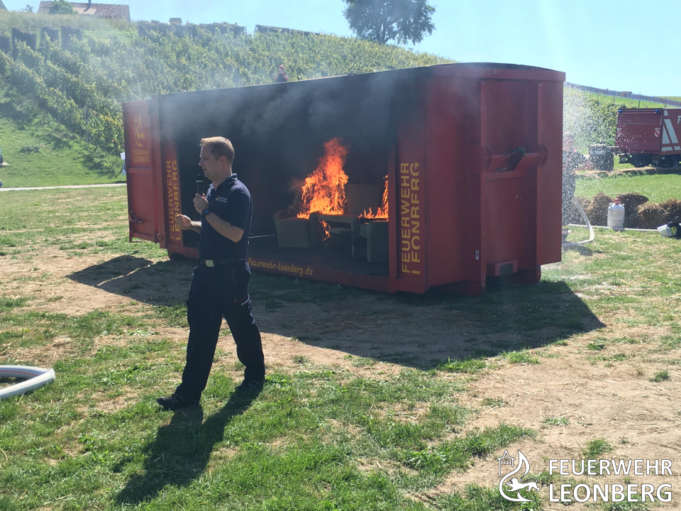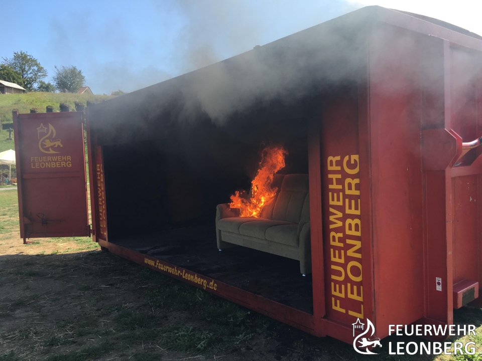 Die Feuerwehr Leonberg folgte gerne der Einladung der Feuerwehr Öhringen und stellte an diesem Tag ihren Brandcontainer zur Verfügung. Es wurden zusammen mit der Freiwilligen Feuerwehr Bretzfeld über den ganzen Tag verteilt Übungen im Brandcontainer durchgeführt. Dafür wurde für ein Wohnzimmer, mittels einer Kerze, entzündet. Die Bürgerinnen und Bürger konnten sich davon überzeugen wie schnell es doch zu einem Brand mit verheerenden Folgen kommen kann. "Rauchmelder retten Leben", dies wurde den Zuschauern schnell bewusst, da der Rauchmelder innerhalb von wenigen Sekunden Alarm geschlagen hat und somit das Feuer noch in seiner Entstehungsphase erkannt werden konnte. Die Feuerwehr Bretzfeld bekämpfte im Anschluss vorbildlich den bereits voll ausgedehnten Brand innerhalb des Containers. Dies zeigte den zahlreichen Zuschauern eindrucksvoll das die bereits 2015 eingeführte Rauchmelderpflicht in Baden-Württemberg durchaus seine Berichtigung findet und Leben retten kann.
