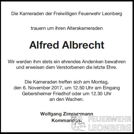 Leider müssen wir heute mitteilen, dass unser Alterskamerad Alfred Albrecht aus Gebersheim am Montag, den 30. Oktober im Alter von 69 Jahren verstorben ist.