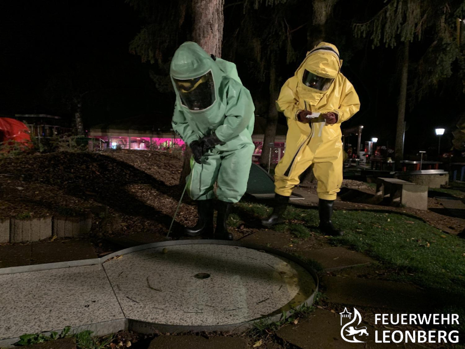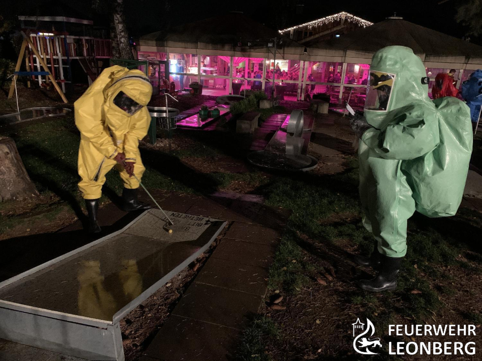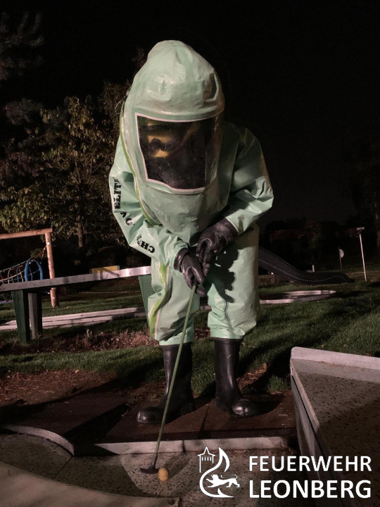 Ein Anblick wie im Katastrophenfall. Warum spielen die im Chemikalienschutzanzug Minigolf ? Diese Frage stellte sich der eine oder andere Besucher der Rutesheimer Freizeitanlage Kraxlalm am vergangenen Donnerstagabend.