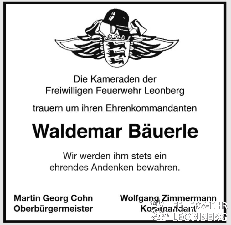 (wz) Unser Alterskamerad und Ehrenkommandant Waldemar Bäuerle aus der Abteilung Höfingen ist am 01.11.2020 im Alter von 90 Jahren im Kreise seiner Familie verstorben.