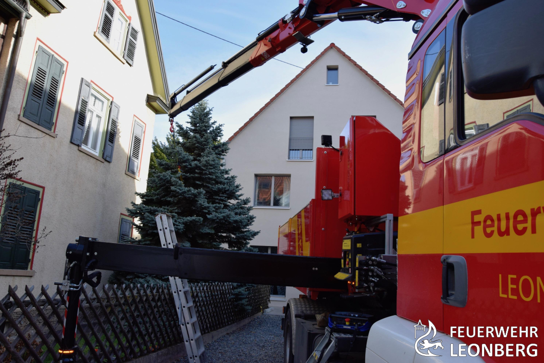 (mf) Einen besonderen Feuerwehreinsatz konnten Passanten am 17.11.2020 in der Feuerbacher Straße beobachten. Dort wurde nämlich eine gespendete Blautanne von zwei Feuerwehrleuten mit Hilfe des neuen Abrollbehälters-Kran aus einem Vorgarten gehievt, zur Feuerwache transportiert und auf das Dach der Fahrzeughalle gehoben.