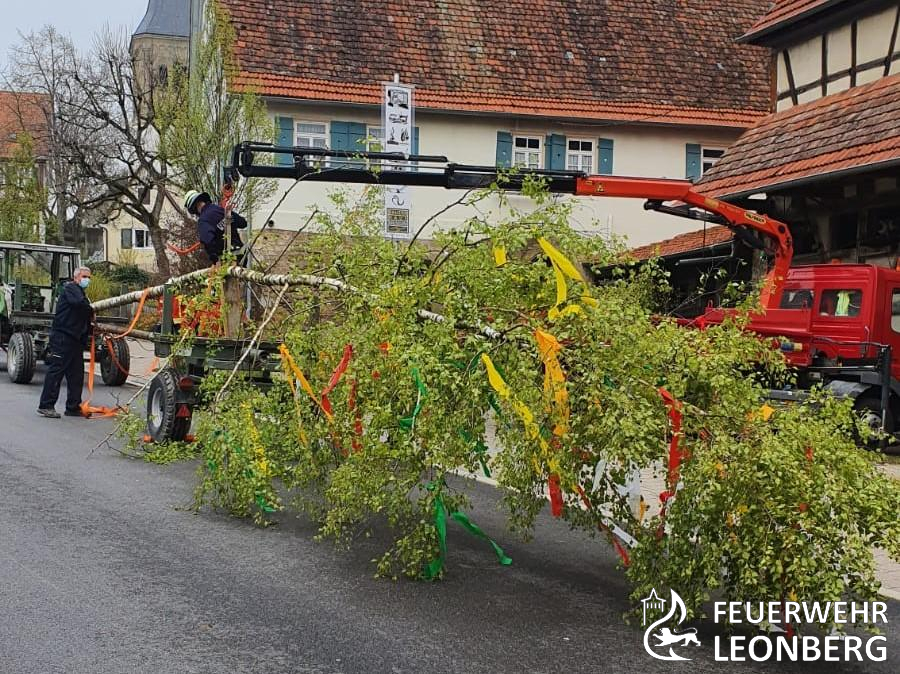 So trafen sich am Morgen des ersten Mai die Mitglieder des Ausschusses zum Maibaumstellen. Nach dem Fällen und Schmücken des Baumes im Wald, wurde dieser mit Hilfe eines Krans vor dem Bauernhausmuseum aufgestellt.