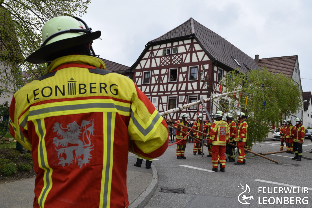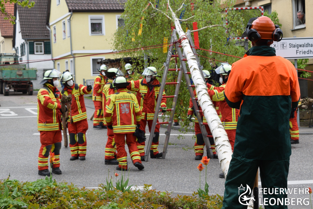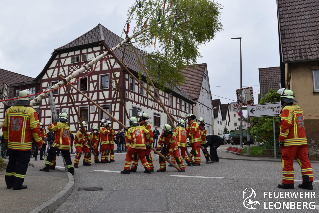 Am nächsten Morgen wurde der Baum geschmückt und anschließend zum Aufstellungsplatz transportiert. Um 10 Uhr stellten 22 Kameraden und Kameradinnen den ca. 18 Meter hohen Maibaum nach alter Tradition auf. Mit Leitern, Halteleinen, Schwalben (lange, mit Seilen verbundene Stangen) und purer Muskelkraft stemmten sie den Maibaum aufrecht, bis er in das vorgesehene Loch rutschte. Nachdem der Maibaum sicher verkeilt war, stiegt ein Kamerad auf die 4-teilige Steckleiter und entfernte die Halteleinen auf ca. 6 Meter Höhe.