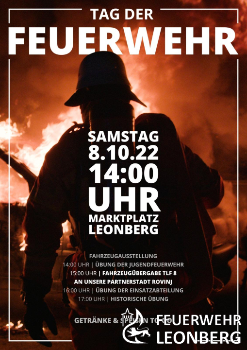 Am Samstag, den 08.10.2022 findet von 14:00 bis 18:00 Uhr der Tag der Feuerwehr auf dem Leonberger Marktplatz statt. Anlass ist die Übergabe eines Unimog-Tanklöschfahrzeuges an die Feuerwehr der Partnerstadt Rovinj durch Oberbürgermeister Martin Georg Cohn.