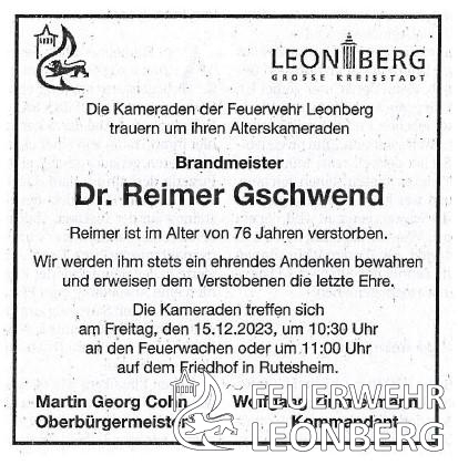 Unser Alterskamerad Dr. Reimer Gschwend, Leitender Notarzt außer Dienst aus der Abteilung Leonberg ist am 28.11.2023 im Alter von 76 Jahren im Kreise seiner Familie verstorben.