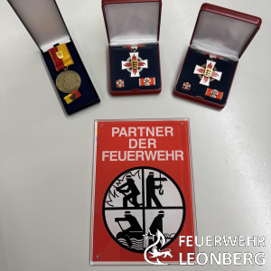 - Ehrenzeichen der Freiwilligen Feuerwehr Leonberg für 30-, 40-, 50- und sogar 70-jährige Mitgliedschaft.